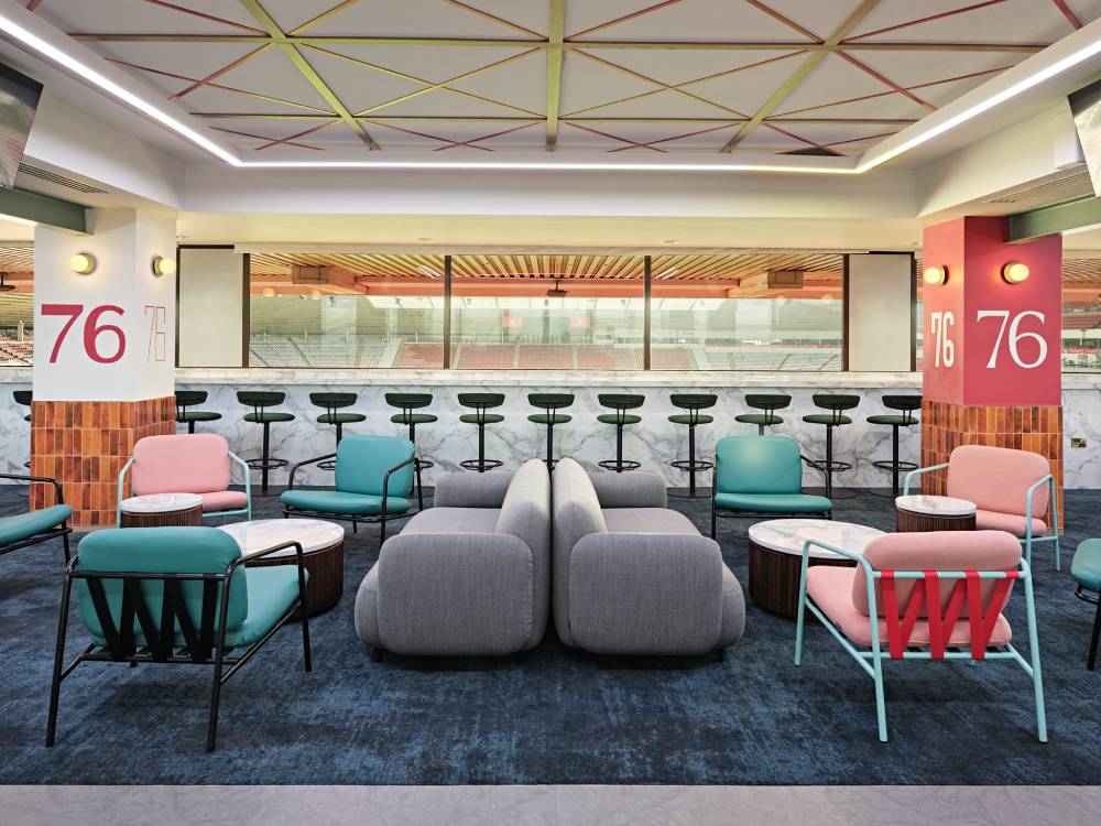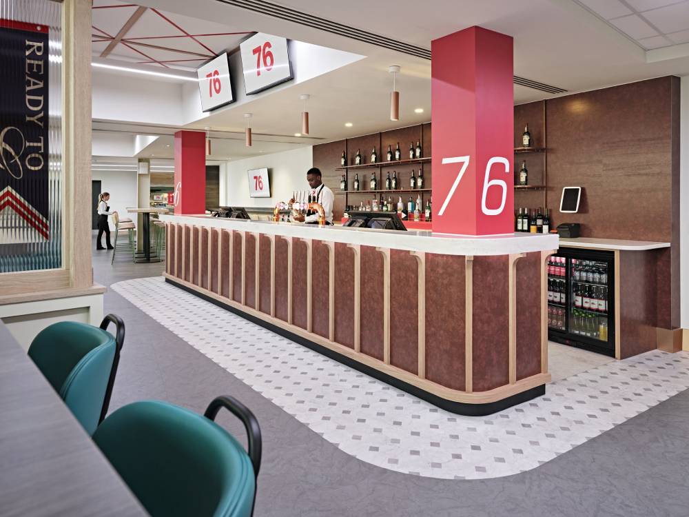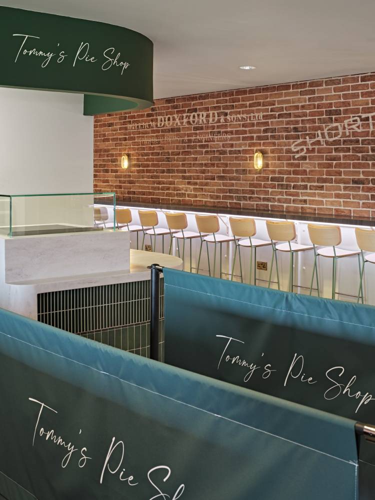The project saw the transformation of the former 8,500 sq. ft Black Cats Bar into 76 Yards, starting with a full strip out of the existing space. The scope of works included alterations to the existing bars, a new open kitchen kiosk, installation of new internal partitions to reconfigure the space, high banquette seating and fixed premium booths, alongside upgraded finishes such as a feature ceiling, new lighting and MEP alterations. Additionally, a new F&B concept was introduced for ‘Tommy’s Pie Shop’ to align with the new food offering.